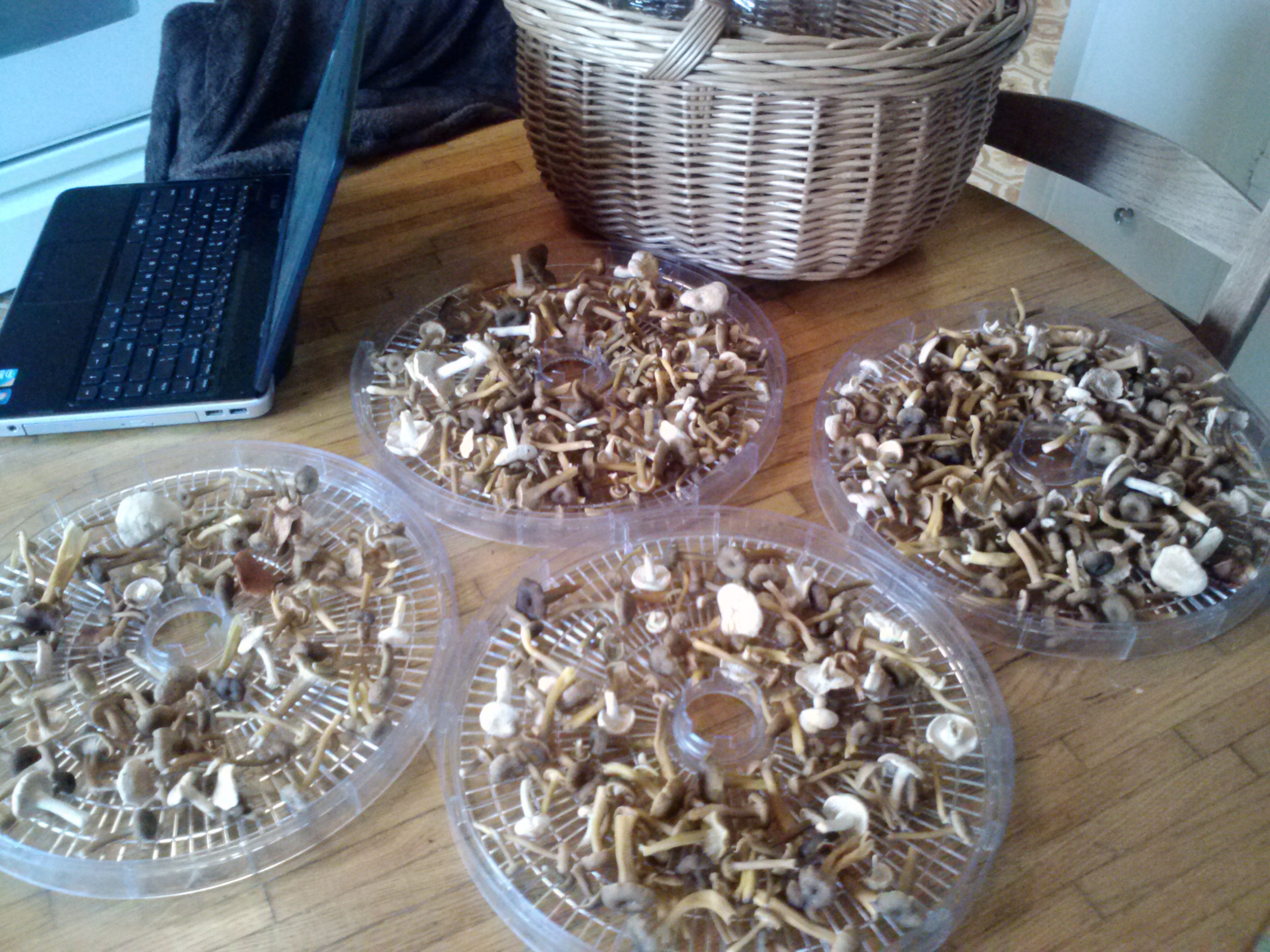Mushrooms are amazing. Plenty of people know far more about them than I ever will, but the little I’ve glimpsed into their world never ceases to fascinate me. They are so varied and beautiful, and full of strange secrets and an odd sense of humor. Candycaps taste and smell like maple syrup, and have the surprising side effect of making your sweat smell strongly like maple syrup for a couple days after eating them. Jellytongues, which like their relatives the hedgehogs can be eaten fresh, are clear, which means they fill up with light and seem to glow. They taste exactly like an unsweetened gummy bear and are amazingly, active against some cancers. We’ve been preserving them in honey.
