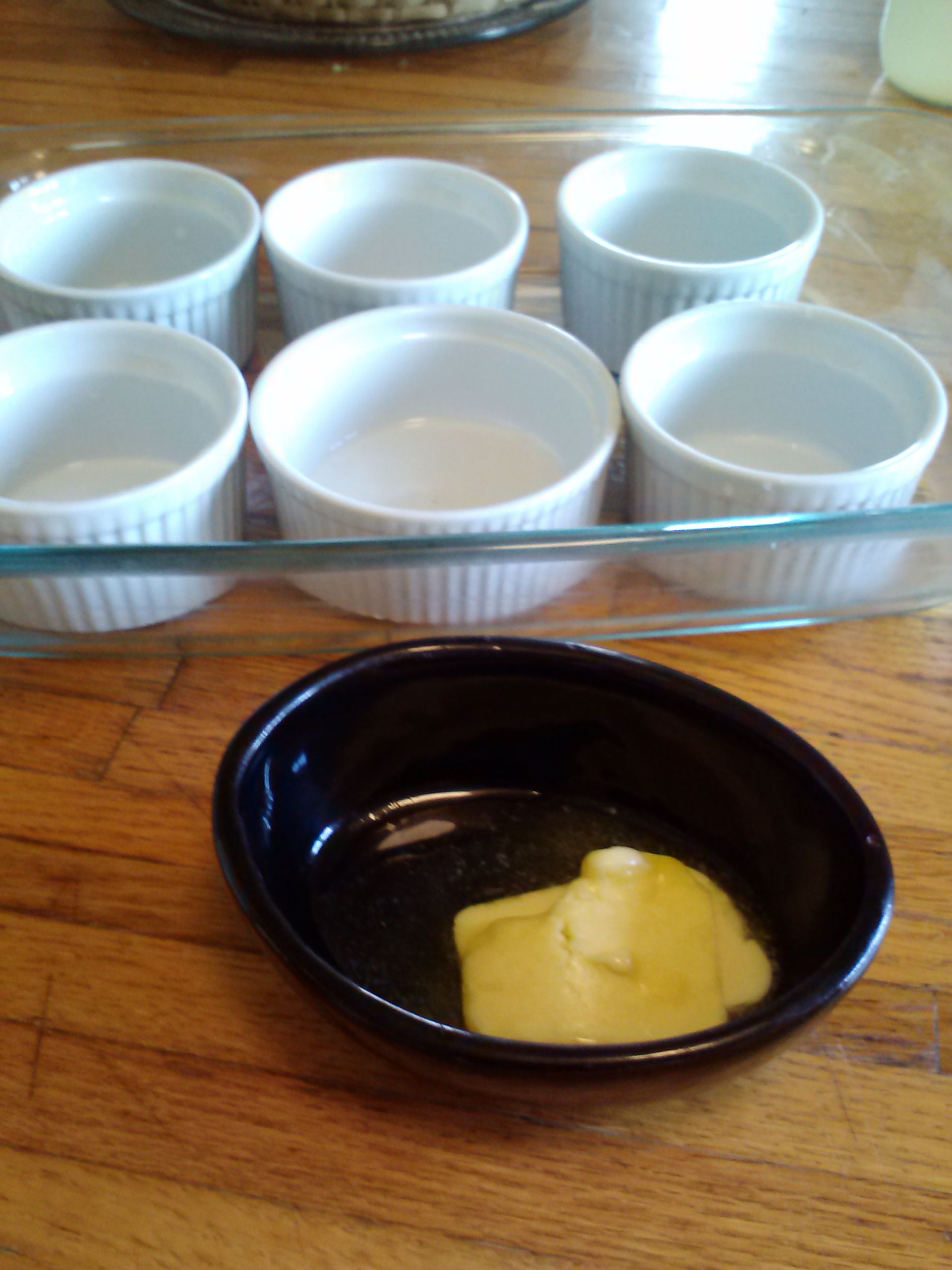I’m warming butter in the oven (thanks Liz) in a ramekin that’s been in my mom’s house since before I was born, to grease the custard cups.
