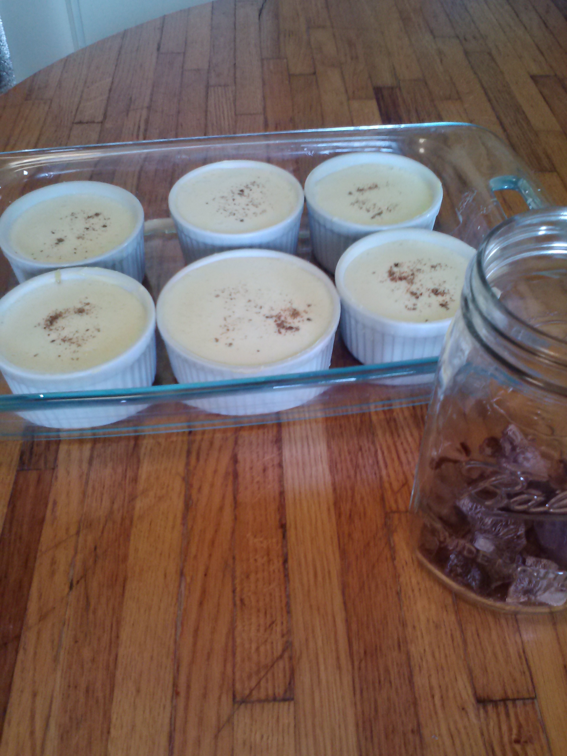 Sprinkle some candycap powder over the top, (thanks Melinda) then I carefully pour boiling water around the custard cups and set them in the 350 degree oven.