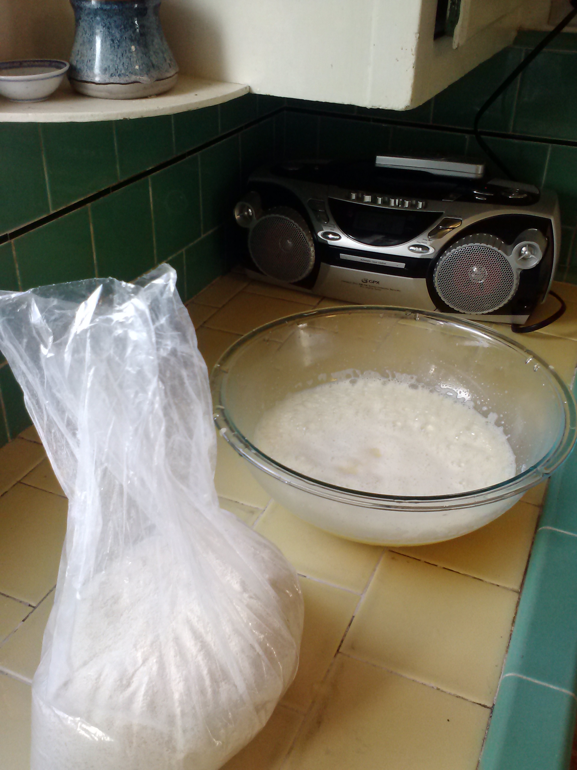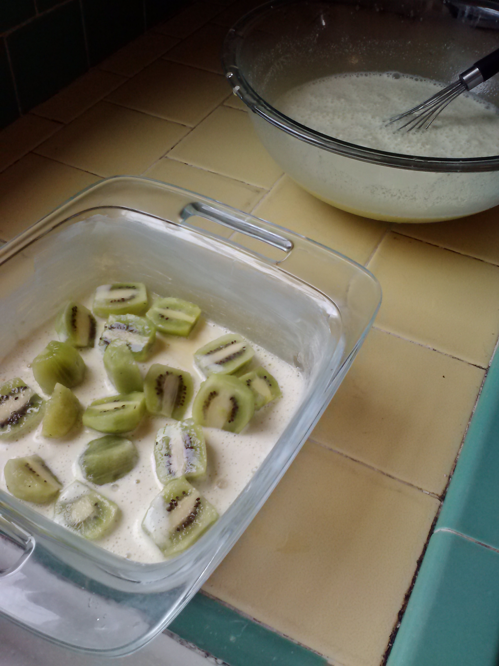 I have extra egg and milk mixture, so I add half a cup of flour, (thanks Doug) and cube some kiwis, (thanks Teresa) to make clafoutis, from my grandma’s recipe book.