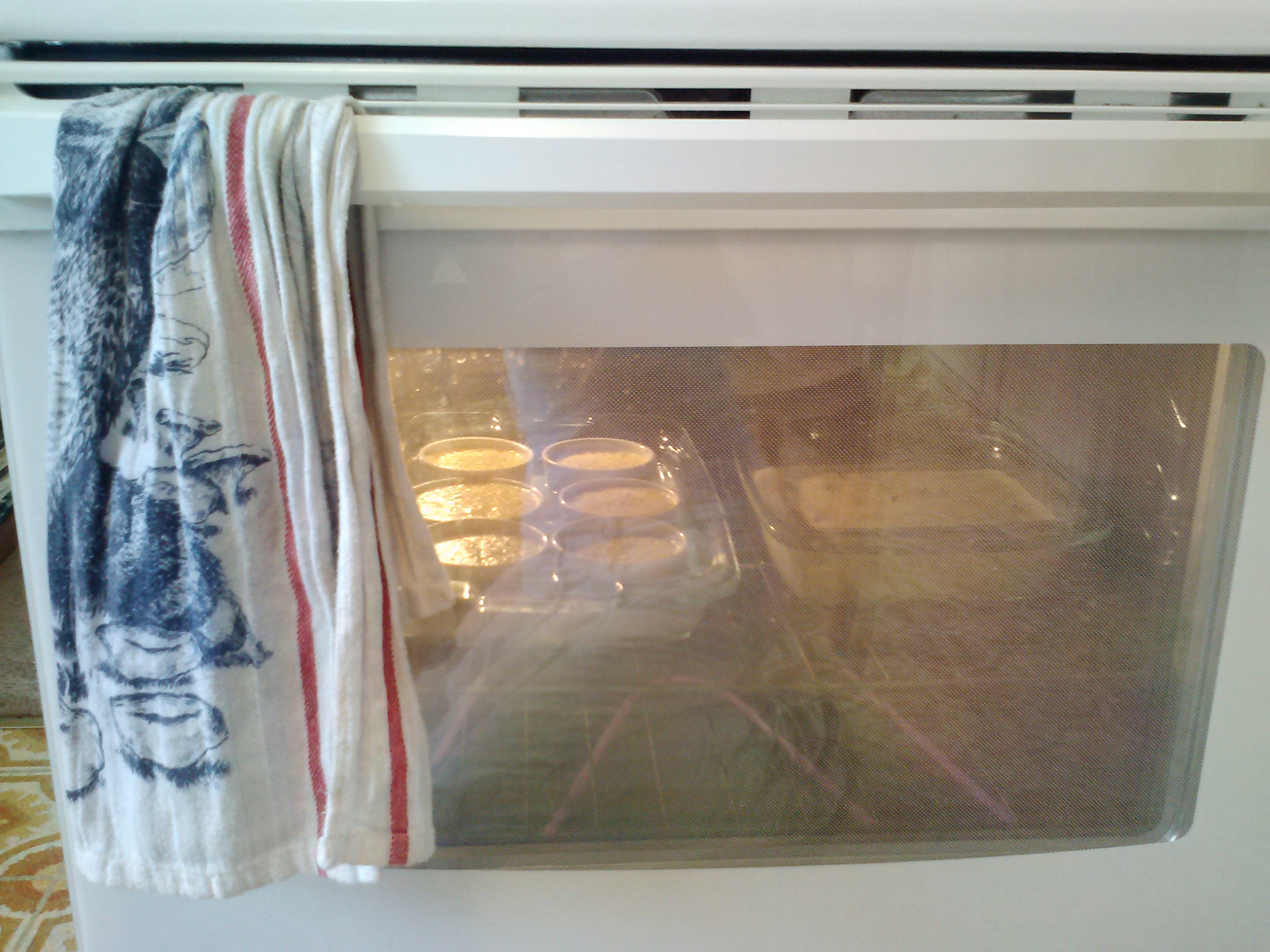 I butter the pan and carry it to the oven, settling it next to the custards with a tea towel. (thanks Lolli and Jacob)