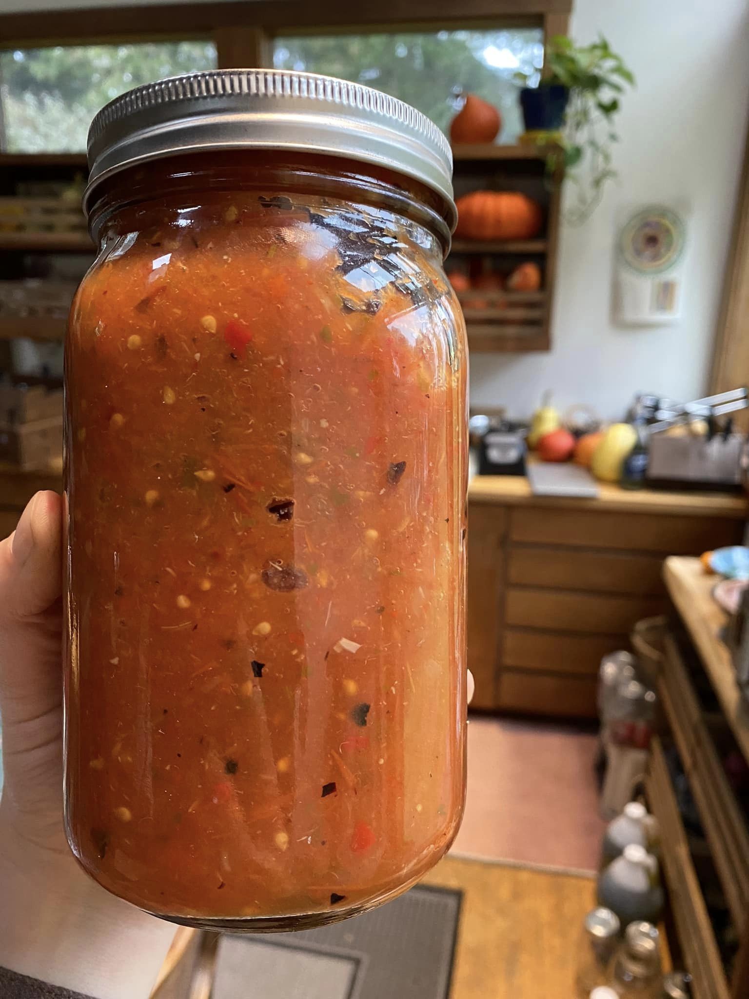 Wiping each jar rim carefully I placed the Ball rubber seal canning lids… and then fumbled around for a ring that actually fit since Late Capitalism doesn’t care about food safety and the Choice and Country Classics type jar rings are not compatible with Ball. This corporate decision ruined several quarts of salsa earlier this year when the rings came off in the canner and earned my ire for all time henceforth. I still have not entirely purged my ring stash of their evil, since I made the mistake of assuming safety standards would require compatibility and sterilized all the quart rings together regardless of brand.
